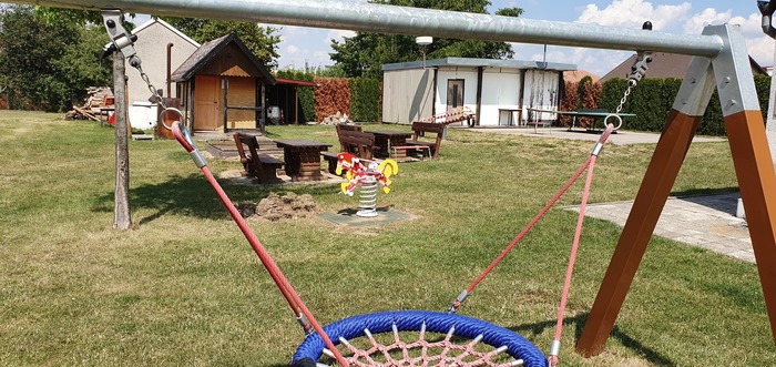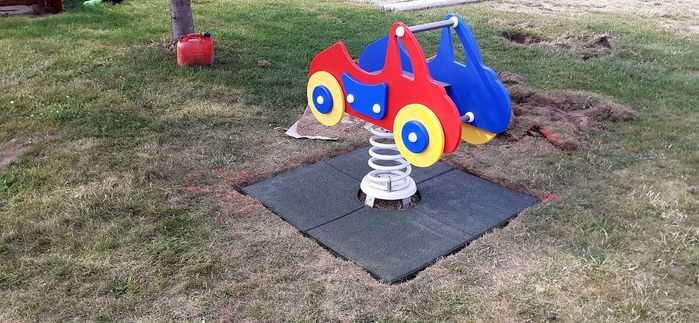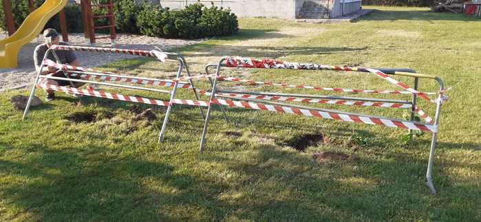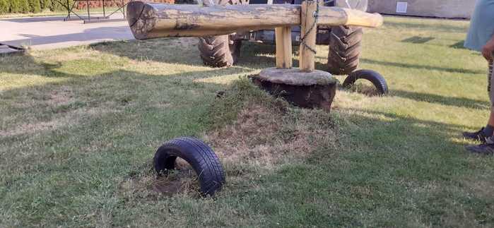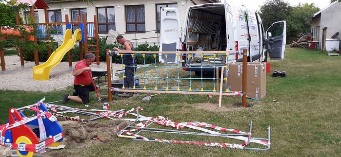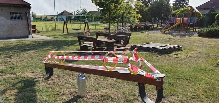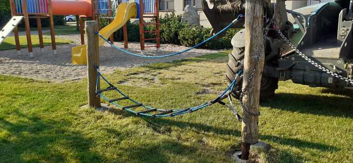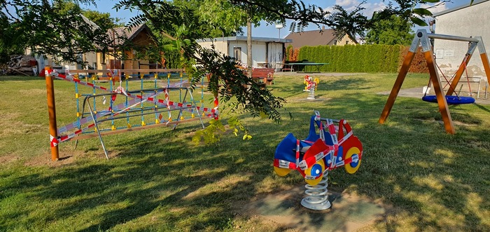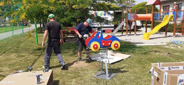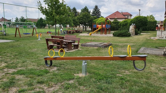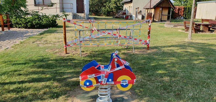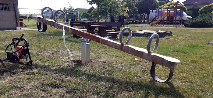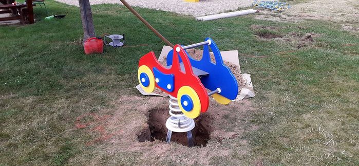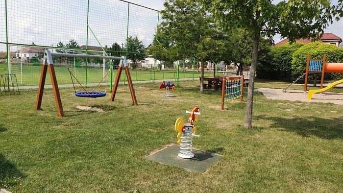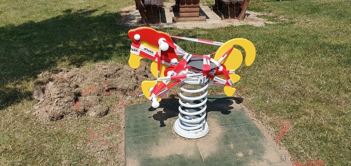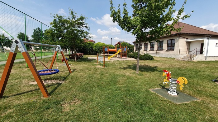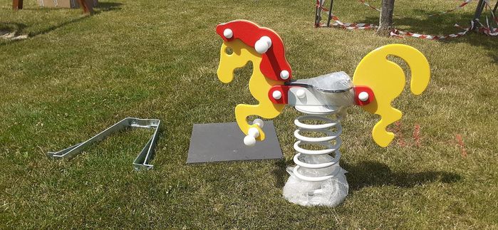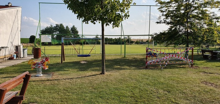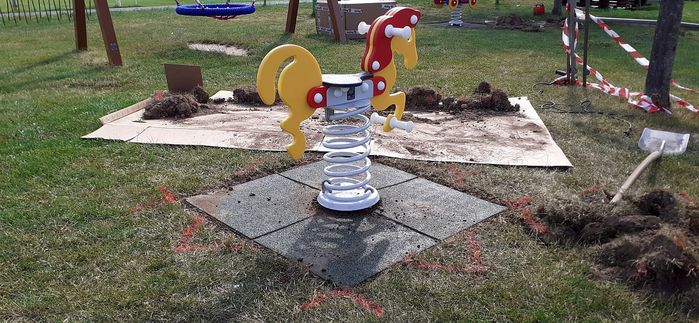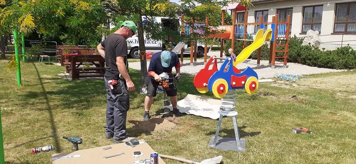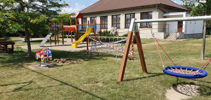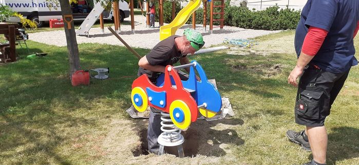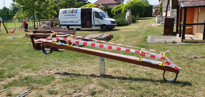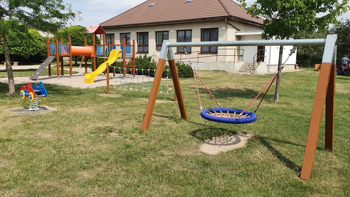 Na dětském hřišti došlo k výměně posledních dvou nevyhovujících (shnilých) dřevěných herních prvků za nové kovové a jsou přidána dvě nová přužinová houpadla.